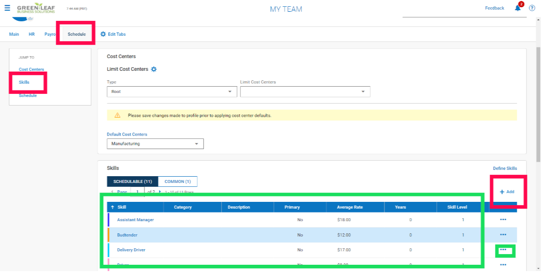 After Skills have been created, they will need to be assigned to the Cost Center that would have this Skill to Schedule.