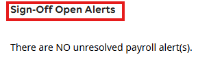 If there are any alerts, they would be here. Click on the alert to resolve. Typical alerts would be missing addresses, manual check alerts to acknowledge, alerting that new hires are being assigned to the state tax jurisdiction, etc. If any alerts are not self-explanatory and you need assistance, reach out to your payroll specialist.