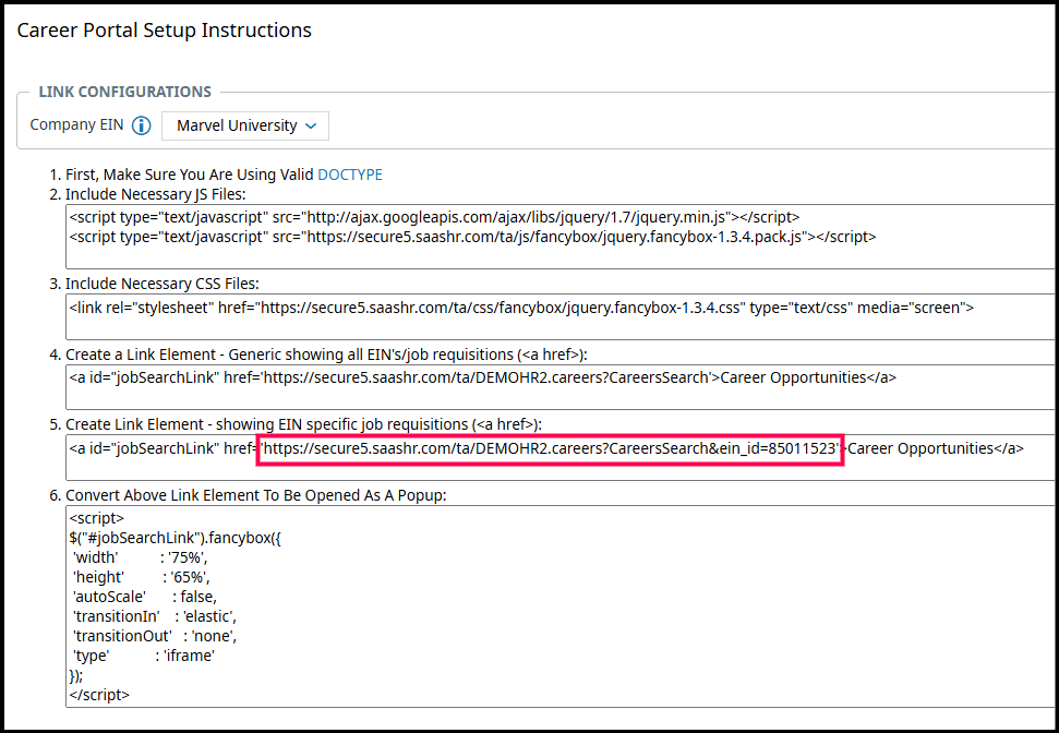 - Within the career portal setup instructions widget, select the link between the 'quotes' as shown in the screenshot below.