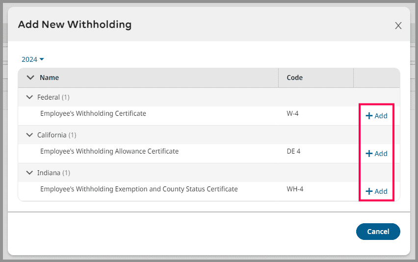3. From the pop-up, select the + Add next to the withholding form you wish to add.