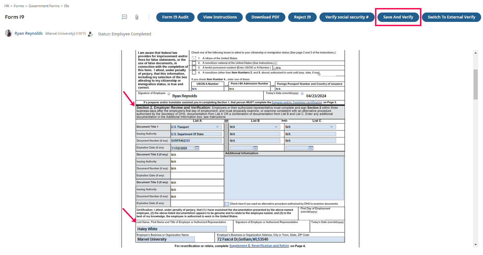 - Once you've completed your portion of the employee's I9, be sure to click to Save & Verify to process the form.