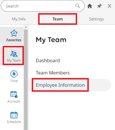 You can use the menu in your upper left hand corner and navigate to Team Tab > My Team icon > Employee Information Report