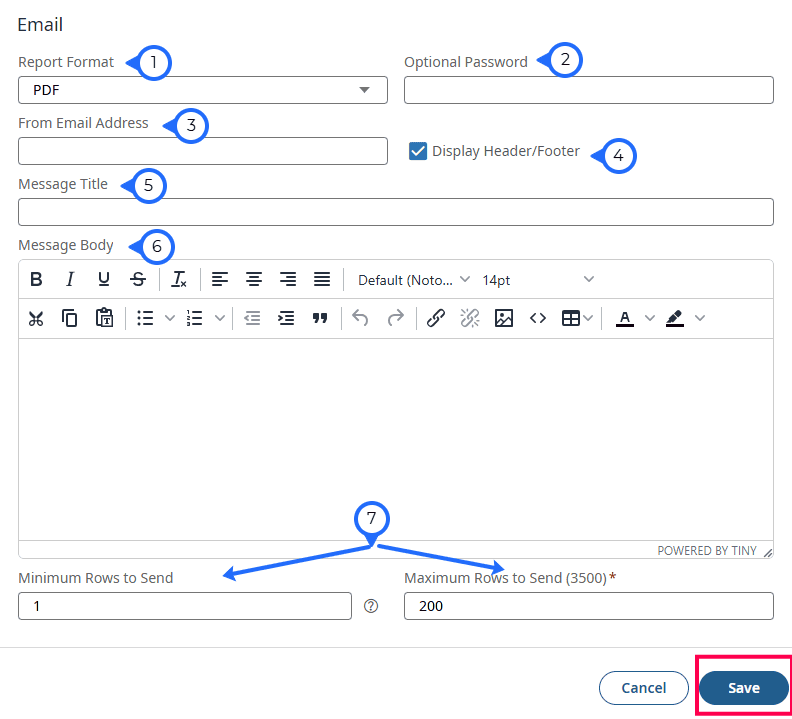 - Message Title: This will be the Subject line that shows within the email. It is recommended to provide a title that explains to the recipients what the attached report contains.