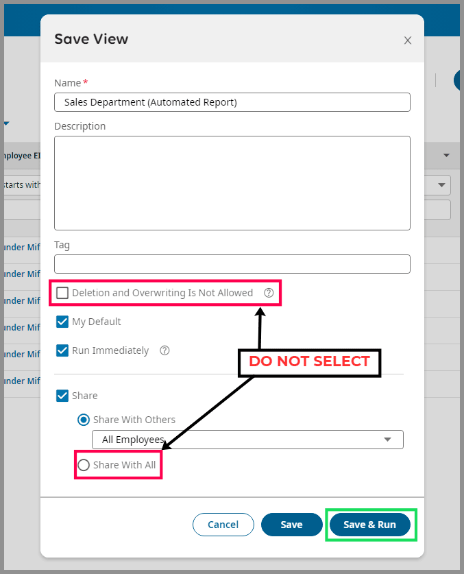 - Recipients Permissions: This option will use the recipients permissions that the file is being sent to. As an example, if you included department as a column in the report but the recipient can't see departments, that information would be left out of the report.
