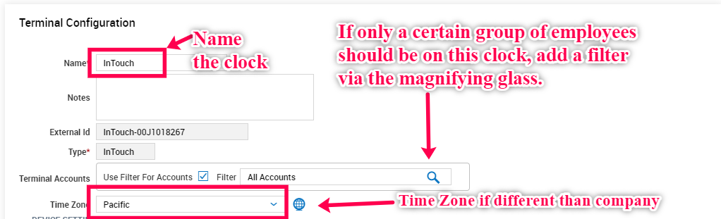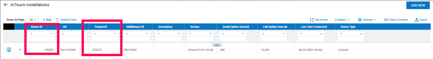 - Enter the Device ID found under the “Device Id” column of the clock within your System Administrator’s Elevated account under System->InTouch Installations