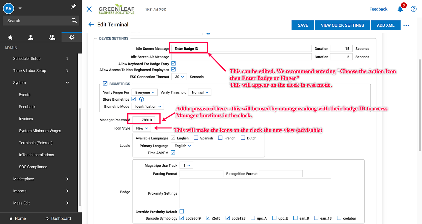 - Update the "Idle Screen Message" to say "Choose the Action Icon then Enter Badge or Finger". This is the message the employees see when they approach the clock.