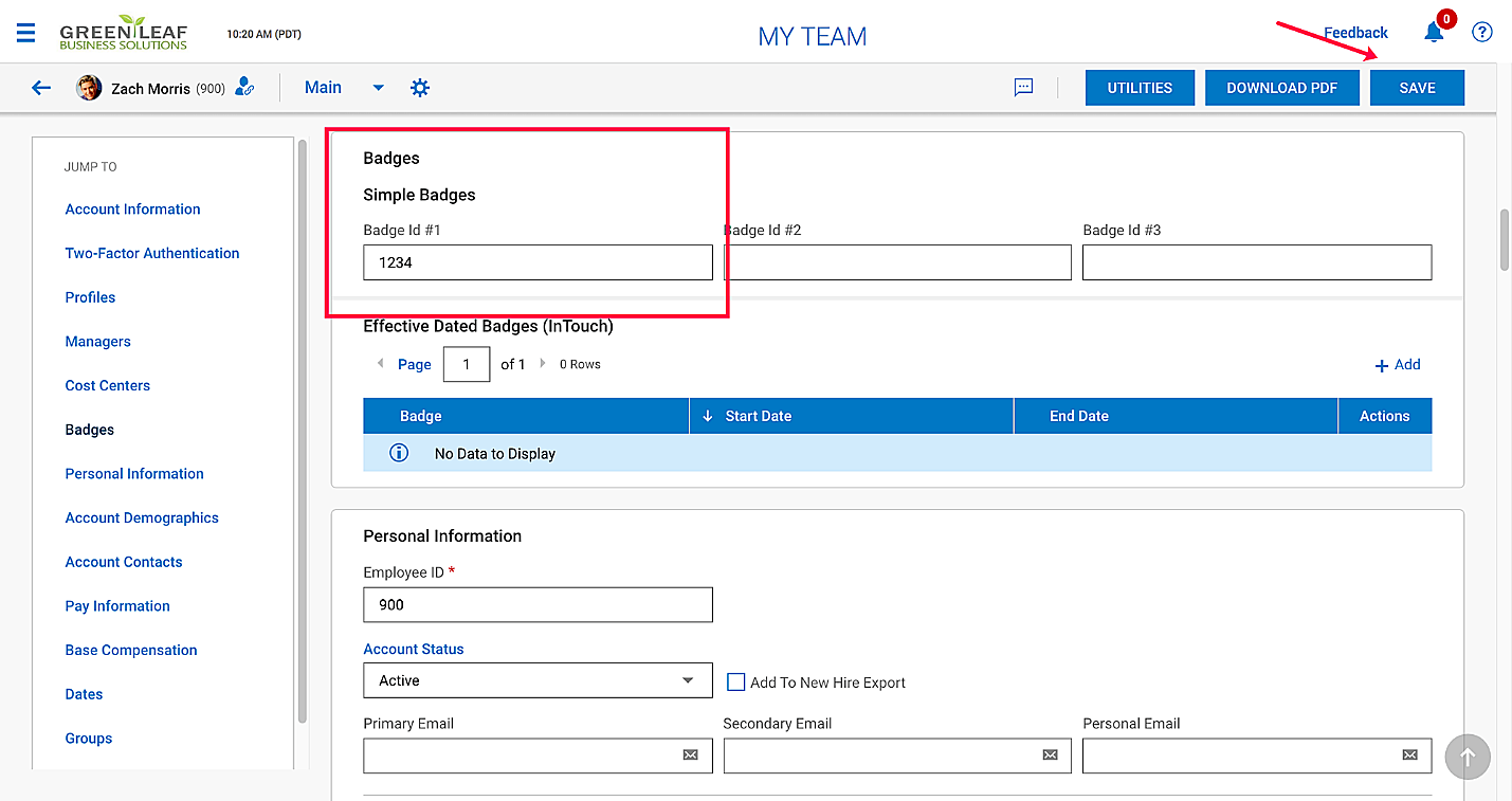 You can see here that there is no badge ID assigned. We must then open up the employee record to add a badge ID. Click on the employee info Icon. Search or locate "Badges" Once there, enter the desired badge ID and SAVE.