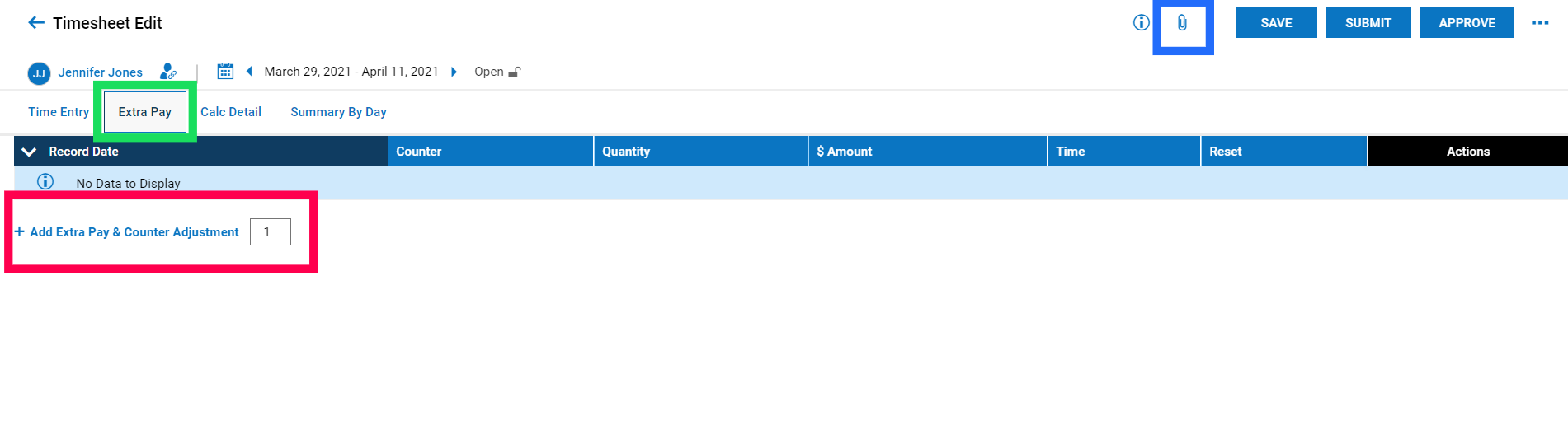 "Extra Pay" is an optional tab based on the company setup, that allows your employees or managers to add an outside pay amount on the timesheet, such as mileage, reimbursements, etc.