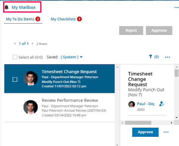 To Approve or Reject pending change requests, look to your "Mailbox" on your dashboard. You can approve or reject right from the mailbox by clicking on the blue arrow next to the request, then you'll see approve or reject. For more detailed info before the approver chooses "Open Timesheet" to view the timesheet in more detail. You can then navigate back to the mailbox to execute. Once approved, changes will automatically update on the timesheet. If rejected, an email will trigger the employee (if your company chose this option).