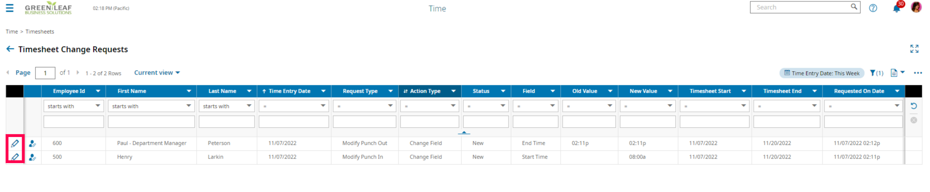 You can now see all outstanding requests and if you'd like to view the timesheet as is, click the "Edit Timesheet" icon highlighted below. Note: all action needs to take place for approving/denying via the inbox mentioned above.