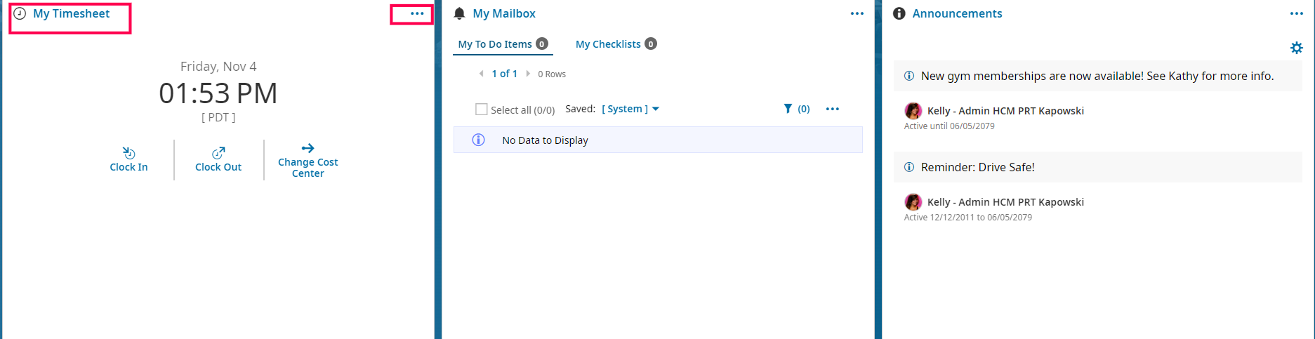 Your Dashboard: This dashboard has more information specific to you as an employee and your role within the company. Each tile is configurable via the three dots, that we call the "Ellipses". You can also click on the blue hyperlink on the upper left corner of any tile to go into the reporting or full function of the tile. NOTE: if a user's clock does not have punch in/punch out function, please refer to the employee profiles to configure.