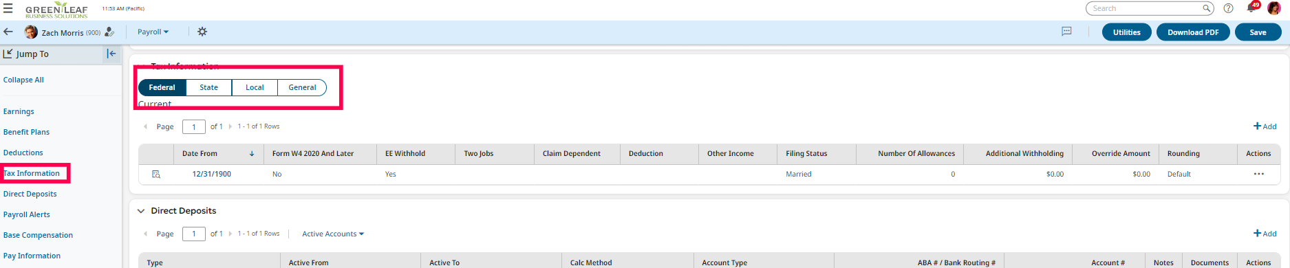 If you'd like to look at the tax setting manually, you can do so by navigating to the employee info. Once within the employee's profile, click on the Payroll Tab > Tax Information.